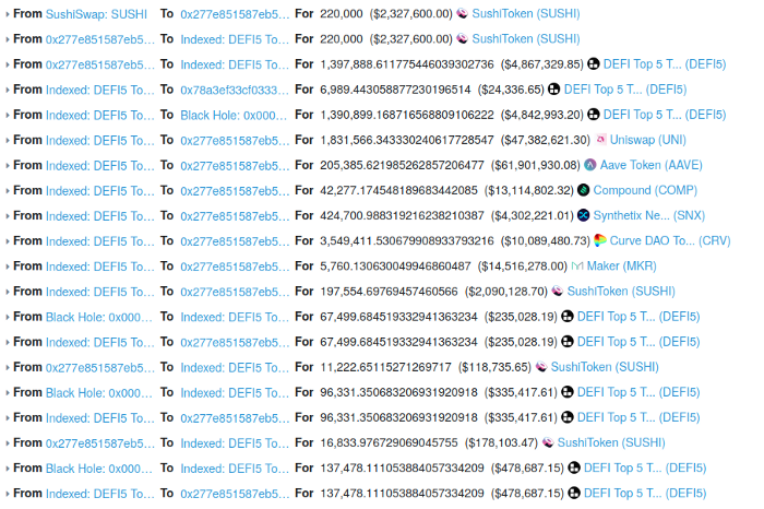 Приобретенные хакером UNI были использованы для эмиссии токенов DEFI5. Заимствованные SUSHI злоумышленник также направил на эти цели (выпуск проходил по завышенной оценке). Манипуляции он повторил несколько раз.