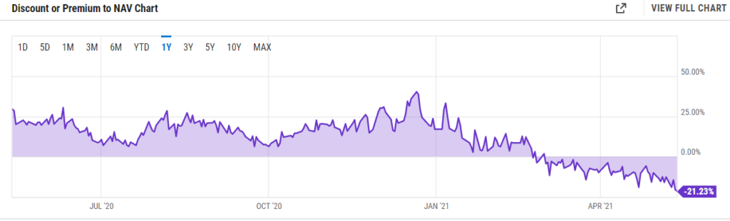 13 мая снижение котировок биткоин-траста (GBTC) от Grayscale Investments относительно чистой стоимости активов (NAV) достигло 21,23%. Дисконт наблюдается с 23 февраля.