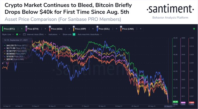 Команда Santiment отмечает, что в результате сентябрьского падения рынка потери крупнейших цифровых валют оказались рекордными. Например, XRP и ChainLink (LINK) рухнули с 6 сентября на 36% и 38% соответственно.