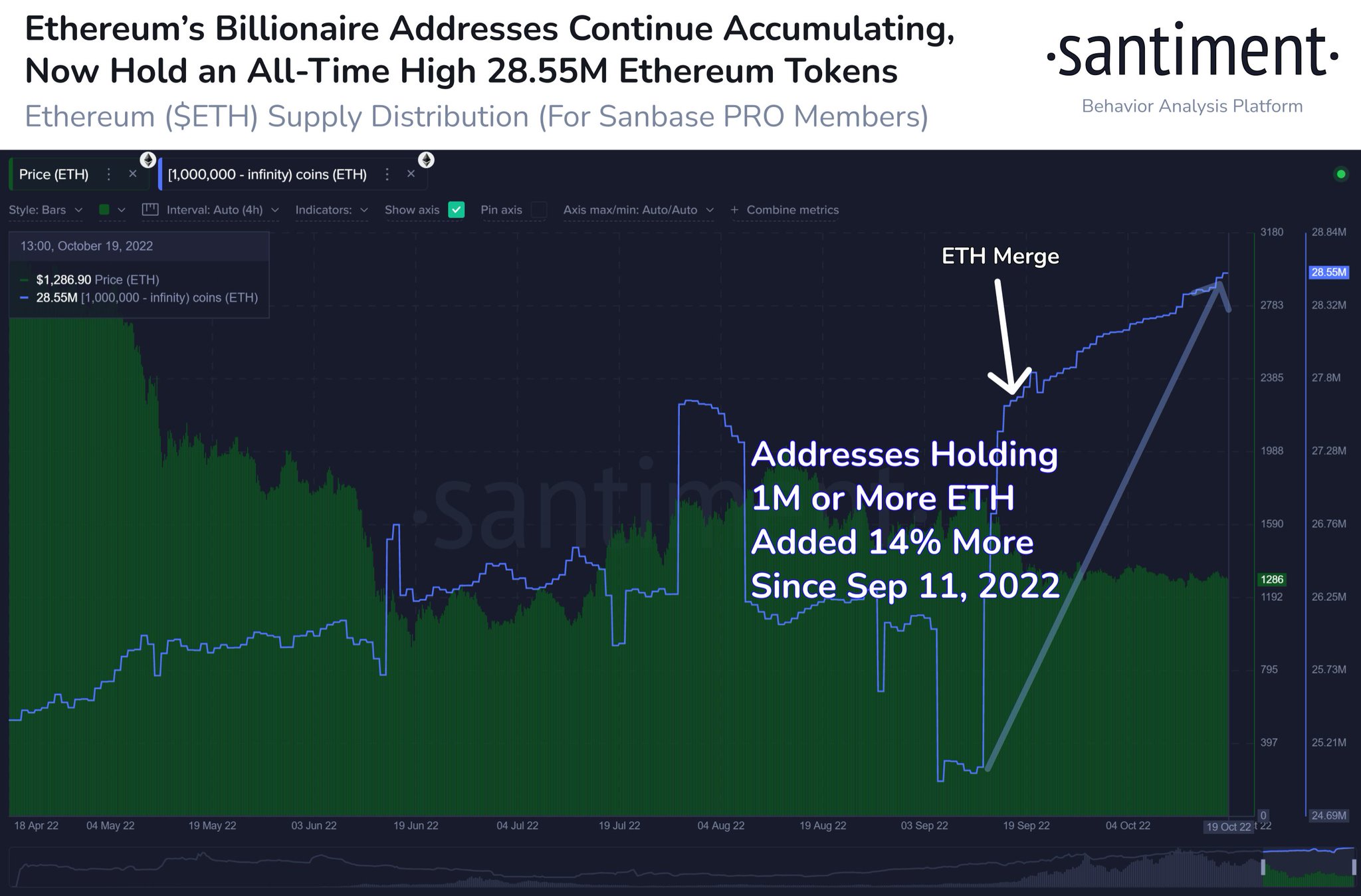 Эфир прибавлял в стоимости в августе и начале сентября перед форком Merge, завершившим переход сети на консенсус Proof-of-Stake. За несколько дней до обновления эфириума курс ETH стал падать, этим и воспользовались китовые кошельки, удерживающие более 1 млн ETH.
