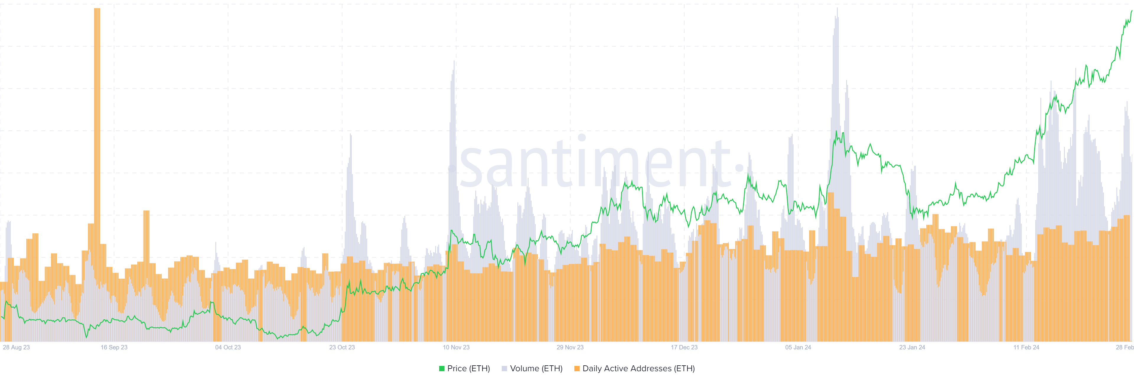 По данным платформы Santiment, среднесуточное число активных адресов в сети эфириума 27 февраля выросло до 531 860.