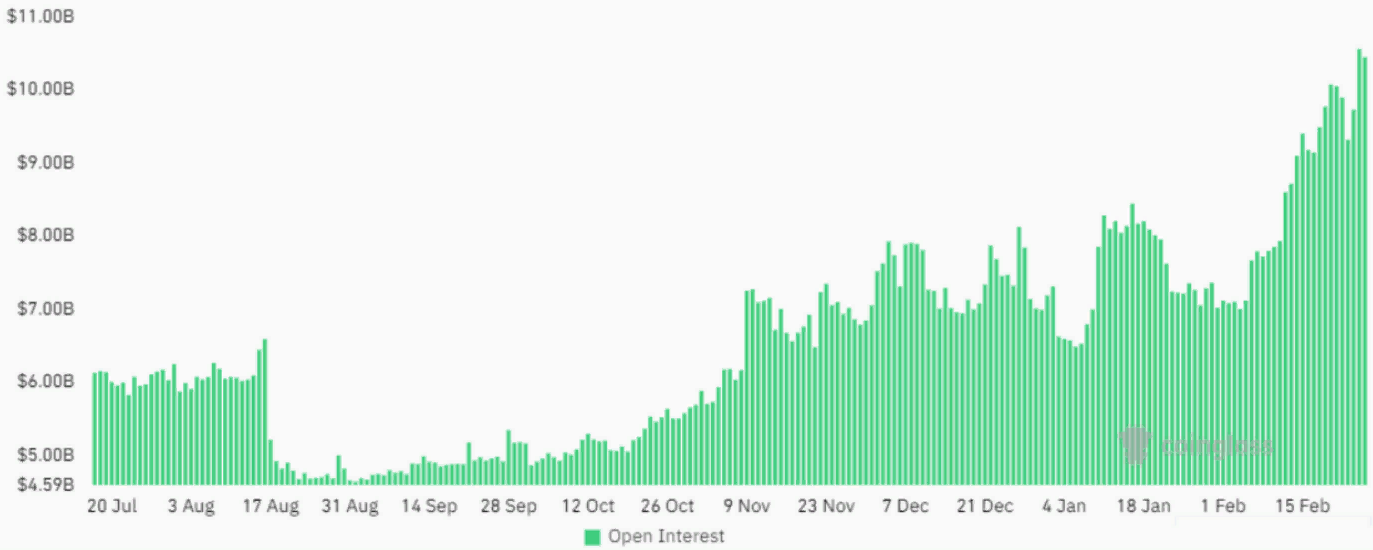 Открытый интерес к фьючерсам на ETH превысил $10 млрд - это максимальный показатель с ноября 2021 года, когда он превышал $11 млрд.