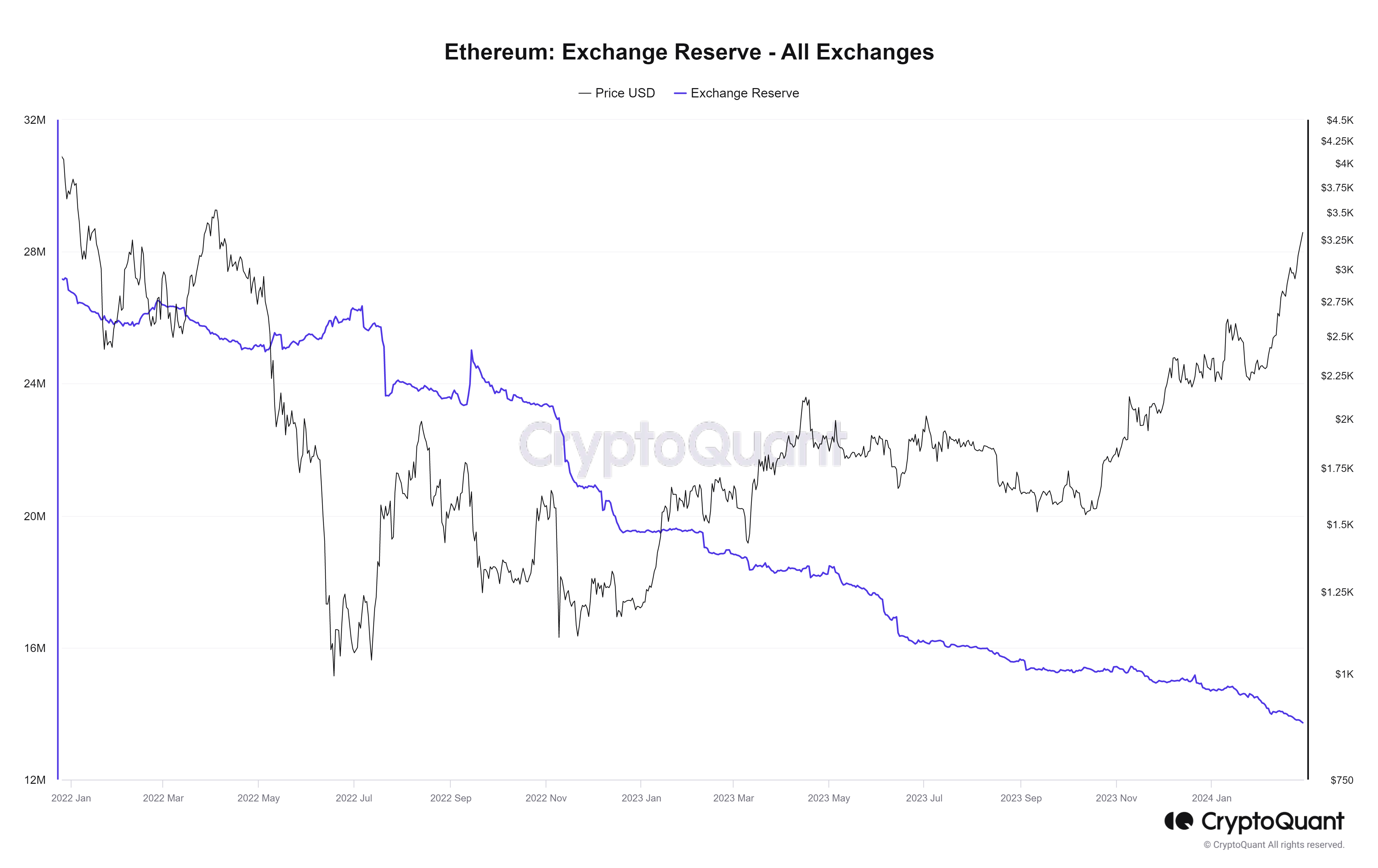 Данные CryptoQuant показывают, что все больше эфира уходит на внебиржевое хранение. Инвесторы отправляют криптовалюту на автономные кошельки.