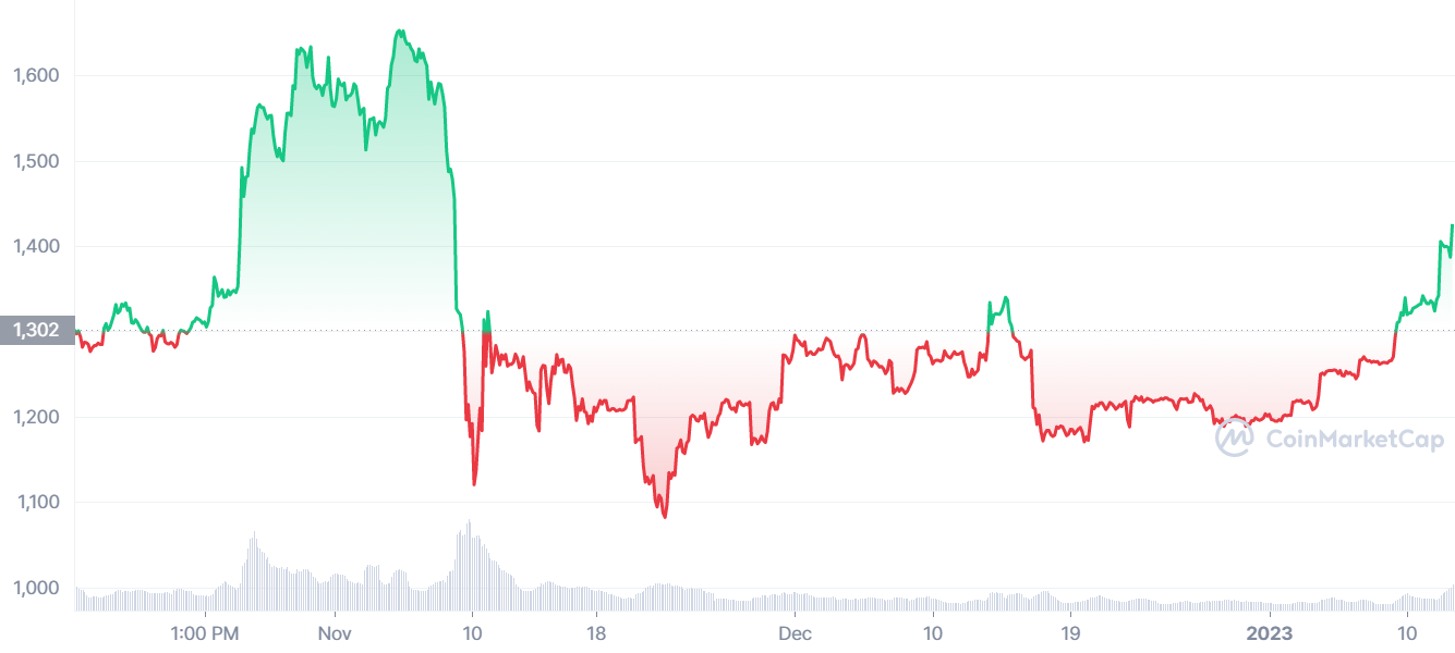 22 ноября эфир рухнул до $1092 в результате обострения волатильности после крушения FTX. В этом районе поддержка усилилась, и многие аналитики заявили, что монета достигла дна.