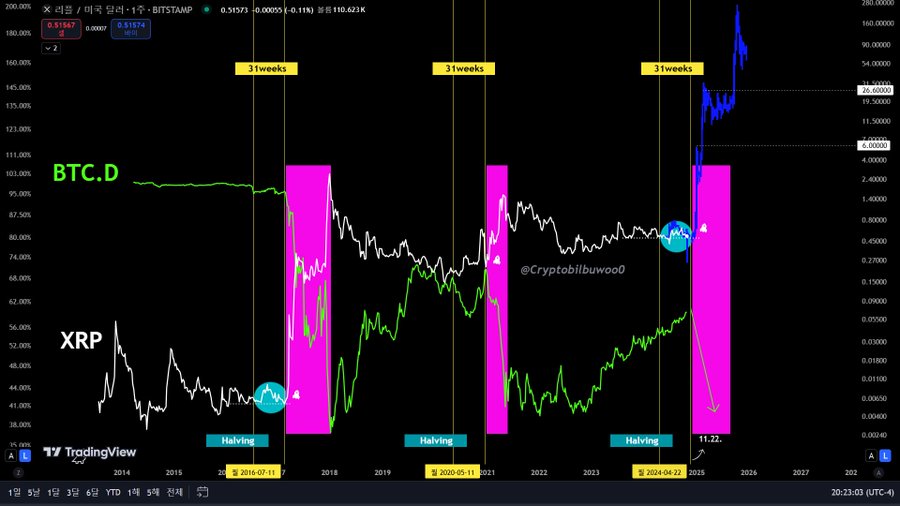 График от Cryptobilbuwoo отслеживает цену XRP вместе с доминированием биткоина (BTC.D) в течение обширного периода времени. Модель показывает уникальный 31-недельный цикл после каждого халвинга биткоина, в котором XRP достигает своей самой низкой точки.