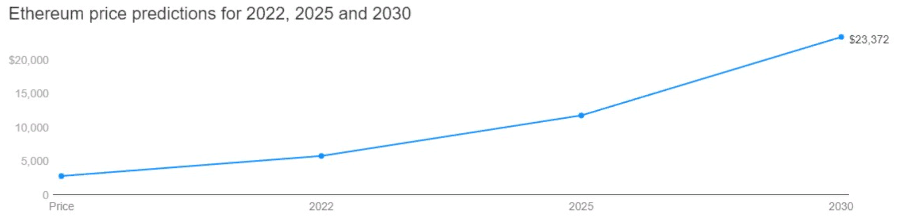 2022 год эфир может завершить на уровне $5783, говорится в обзоре аналитиков. К 2025 году крупнейший альткоин может достичь $11 764, а к 2030 году – $23 372.