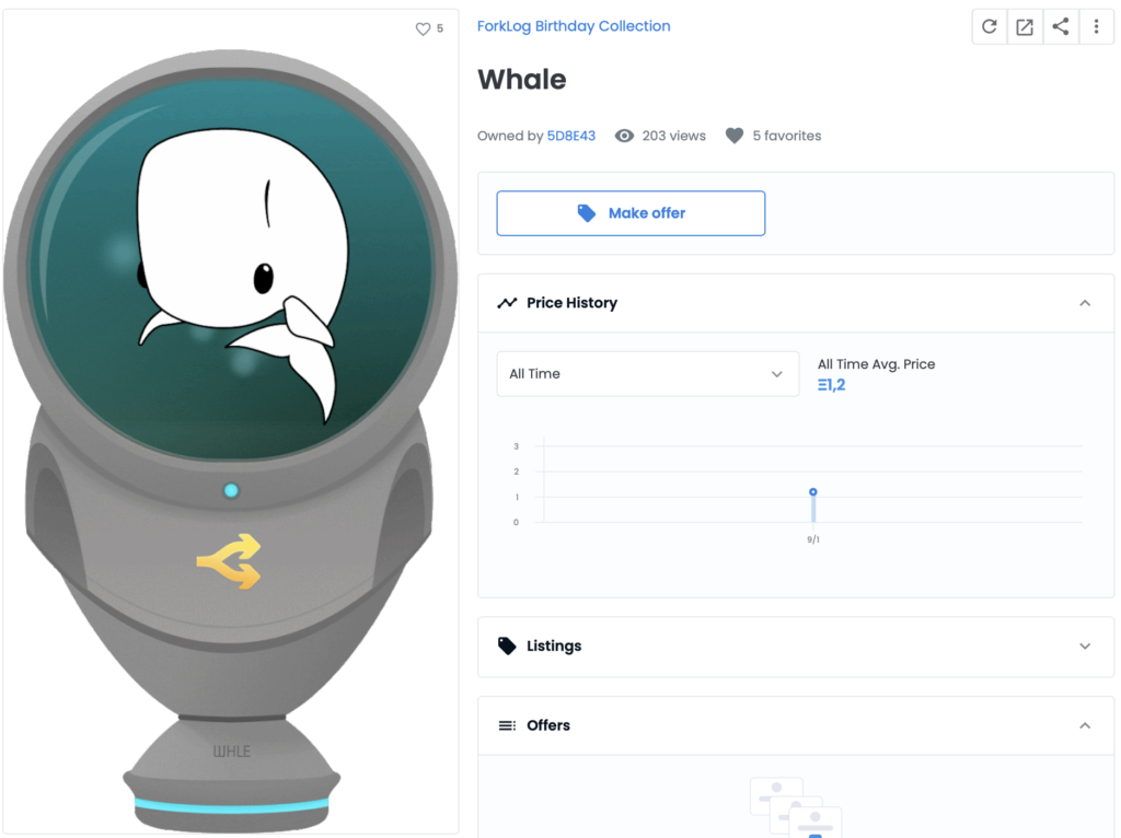 Самым дорогим NFT из коллекции ForkLog оказался анимированный кит, символизирующий крупнейших представителей индустрии. Токен купили за 1,2 ETH (около $4400 по курсу на момент написания).