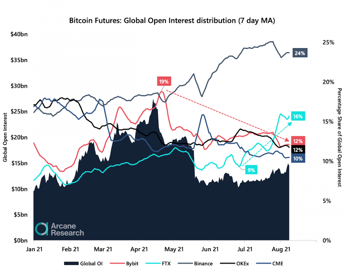 Если в конце июня на долю FTX приходилось около 9% рынка фьючерсов на BTC, то уже в начале августа данный показатель достиг 16%.