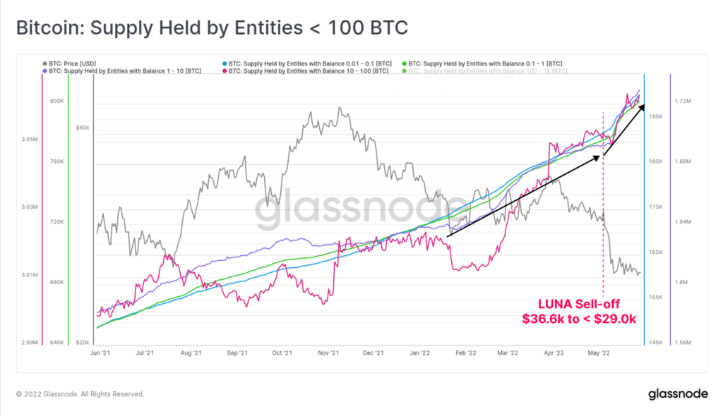 Проданные LFG 80 081 BTC перешли к частным инвесторам и организациям, среди которых выделяются владельцы кошельков с балансом менее 100 BTC. Их совокупная позиция выросла на 80 724 BTC, поглотив возросшее предложение от стоящей за UST некоммерческой организации.