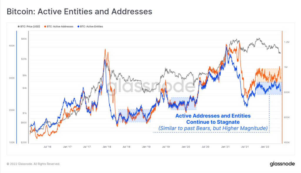 В отличие от подобных ситуаций в прошлом нынешняя волна снижения не привела к притоку новых пользователей — число активных адресов продолжило стагнировать.