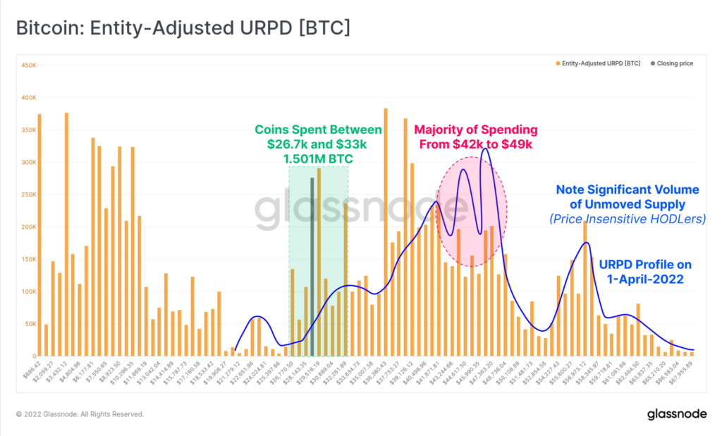 Представленный ниже график иллюстрирует значимую «разгрузку» 1,5 млн BTC в диапазоне от $42 000 до $49 000 и переход монет к покупателям в коридоре от $26 000 до $33 000.