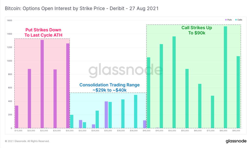 Распределение открытого интереса по месячным биткоин-опционам с различными страйками. Данные: Glassnode.
