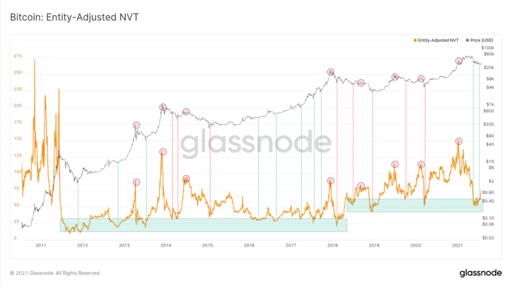 Аналитики проверили степень корректности текущей оценки по индикатору NVT Ratio (Network Value to Transactions Ratio). Они сделали поправку, исключив внутренние переводы между адресами, принадлежащими одному и тому же владельцу.