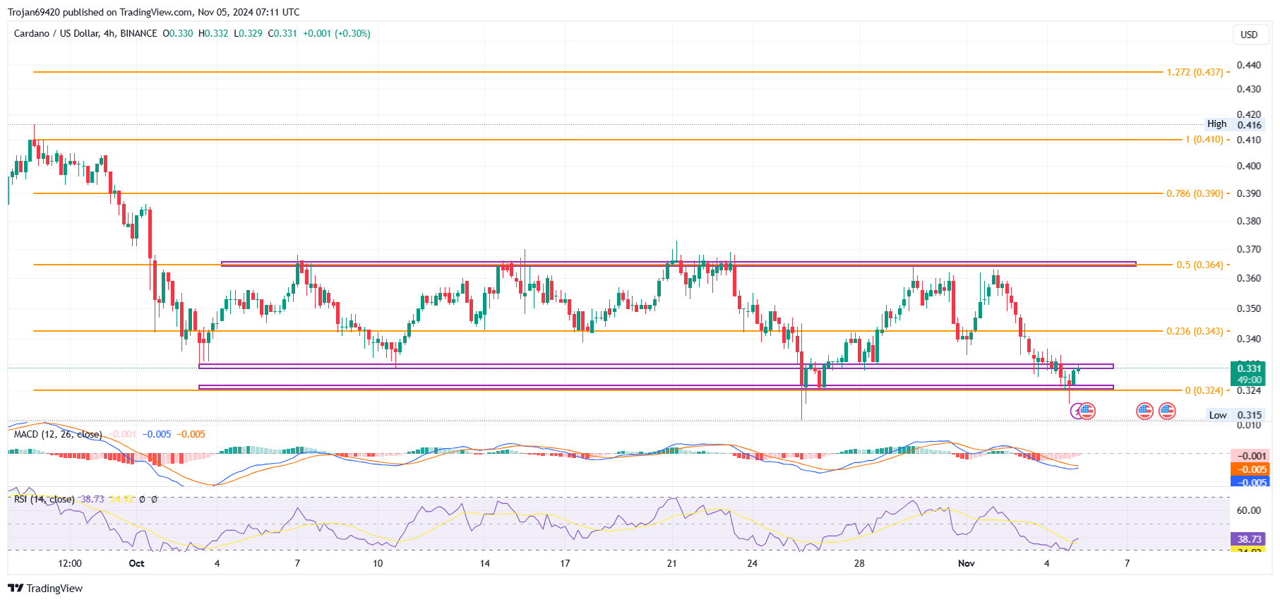 На 4-часовом графике ценовое действие Cardano показывает боковой тренд. Более того, медвежье влияние на диапазон консолидации постепенно усиливается, предупреждая о медвежьем пробое.
