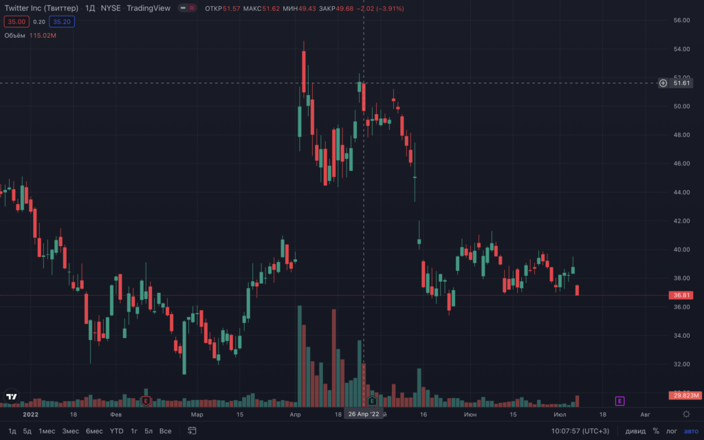 Акции Twitter упали на 28% с момента объявления о покупке соцсети Маском в конце апреля. Сделку планировали закрыть до конца 2022 года.