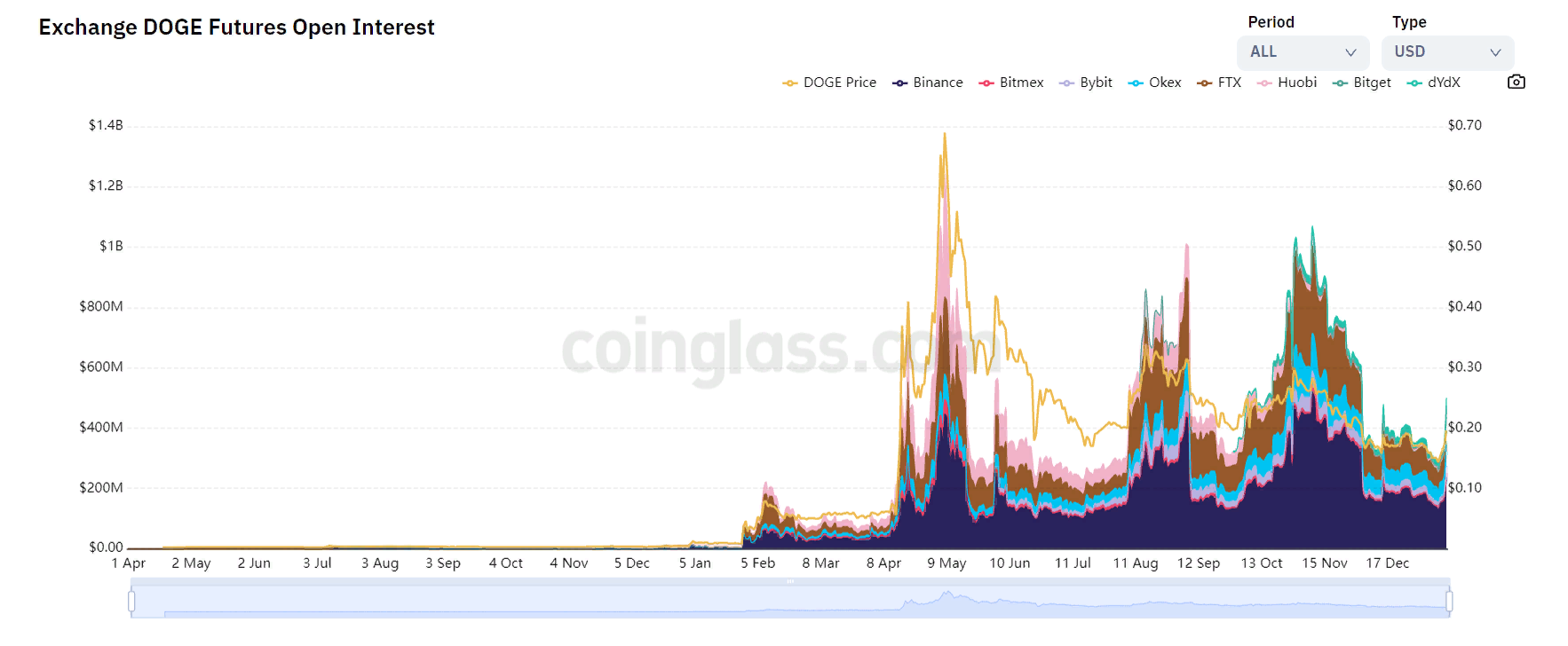 Сейчас открытый интерес к фьючерсам на DOGE находится на самом высоком уровне с начала декабря прошлого года. Львиная доля контрактов размещена на биржах Binance и FTX – $238,13 млн и $103,42 млн соответственно (по данным CoinGlass).