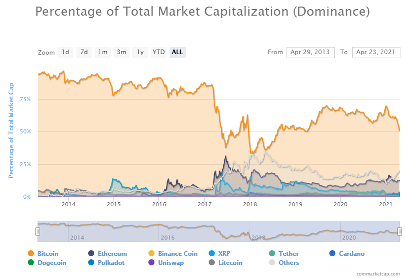 Сейчас этот показатель составляет 50,6%, об этом свидетельствуют данные CoinMarketCap. Последний раз на таком уровне доминирование BTC находилось в апреле 2019 года.