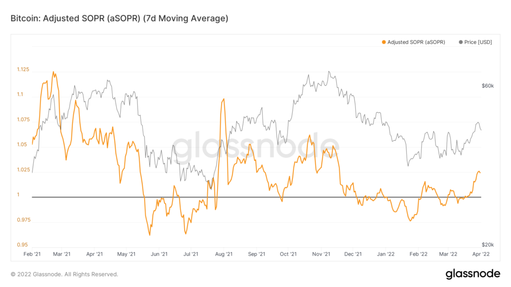 На фоне умеренного восстановления рынка с середины марта индикатор aSOPR (7MA) удерживается над отметкой 1. Это указывает на улучшение рыночных настроений и фиксацию прибыли большинством участников рынка. Об этом говорится в аналитическом отчете ForkLog.