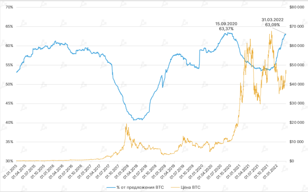 Доля BTC, не перемещавшихся более года. Данные: Glassnode.
