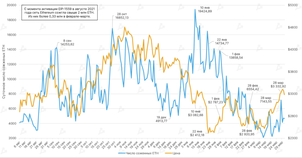 С момента активации EIP-1559 в августе 2021 года блокчейн Ethereum сжег более 2 млн монет. В феврале-марте протокол вывел из обращения свыше 330 000 ETH.