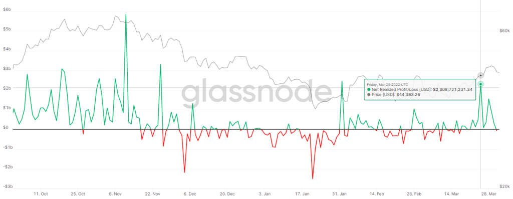 25 марта чистая реализованная прибыль биткоин-инвесторов достигла $2,3 млрд. В последний раз сопоставимые значения показателя наблюдались 1 февраля.