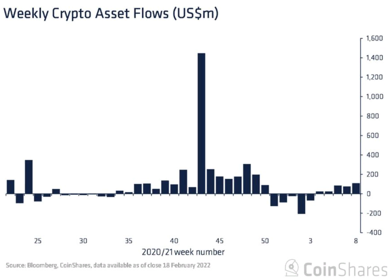 На протяжении последних нескольких недель инвесткомпании вкладываются в криптофонды. Если в январе, напротив, наблюдался отток капитала из продуктов, ориентированных на цифровые активы, то уже в этом месяце институционалы вновь стали демонстрировать повышенный интерес к таким инструментам, говорится в очередном докладе компании CoinShares.