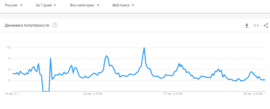 Если посмотреть на представленный график, то можно заметить, что 26 и 27 августа наблюдались всплески активности россиян, интересующихся биткоином.