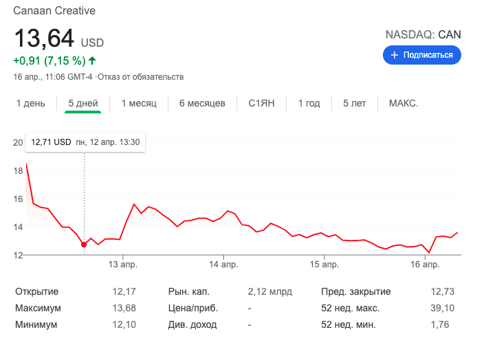 После этого стоимость акций Canaan упала с $18,50 до $12,71.