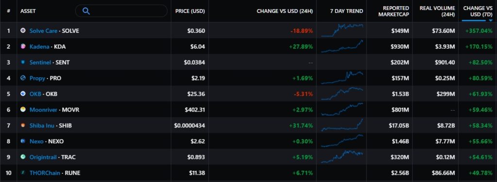 По данным сервиса Messari, сильнее всего подорожал токен медицинской блокчейн-платформы Solve.Care. Его цена выросла на 357%, а капитализация составила $149 млн.