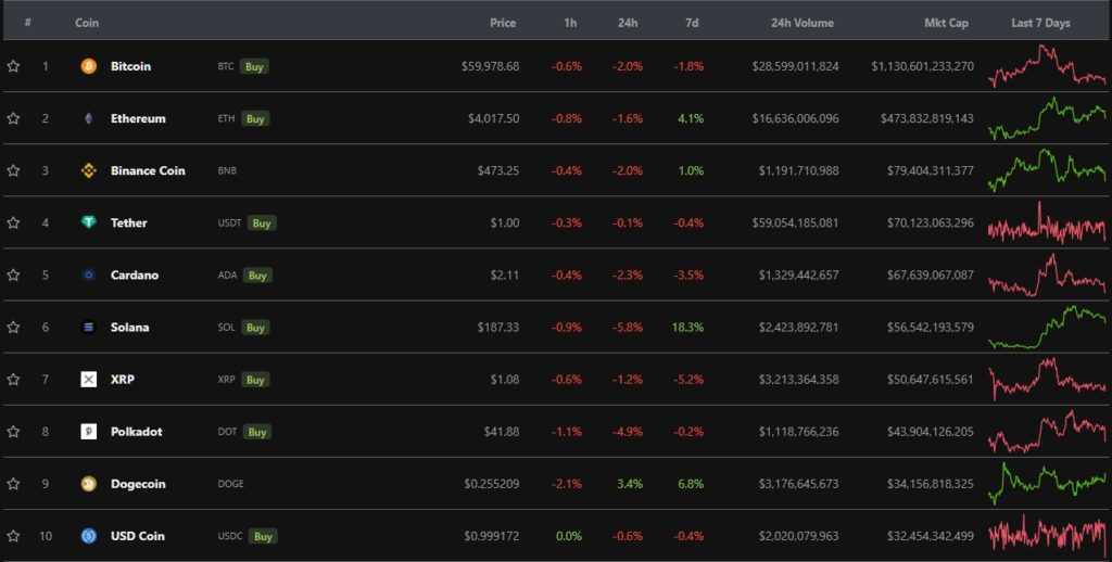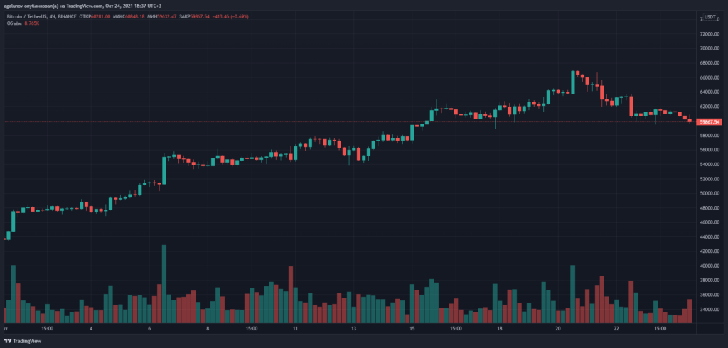 Биткоину не удалось закрепиться на достигнутом уровне. На момент написания актив торгуется вблизи $59 900.