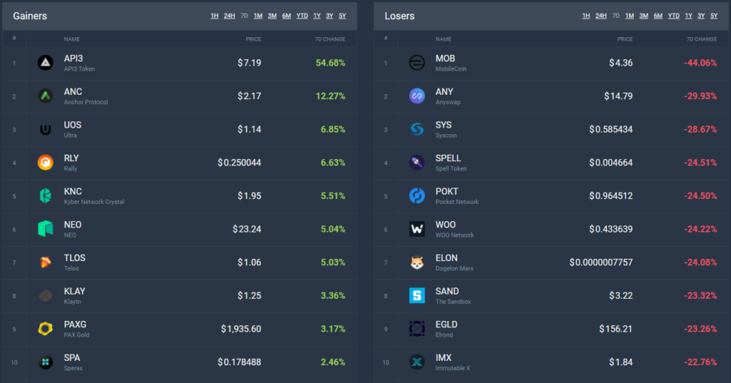 По данным сервиса CoinCodex, за неделю из цифровых активов с умеренной капитализацией больше всего подорожал токен децентрализованной автономной организации API3. Его цена выросла на 54,68%.