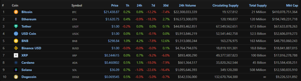 Среди топ-10 криптовалют рейтинга CoinGecko еще глубже за неделю просели цены Ethereum (-18,3%), Cardano (-18%) и Solana (-22,6%).