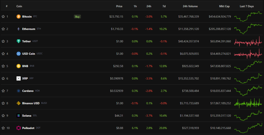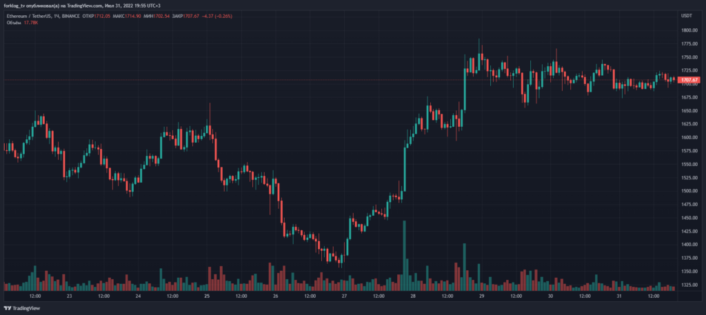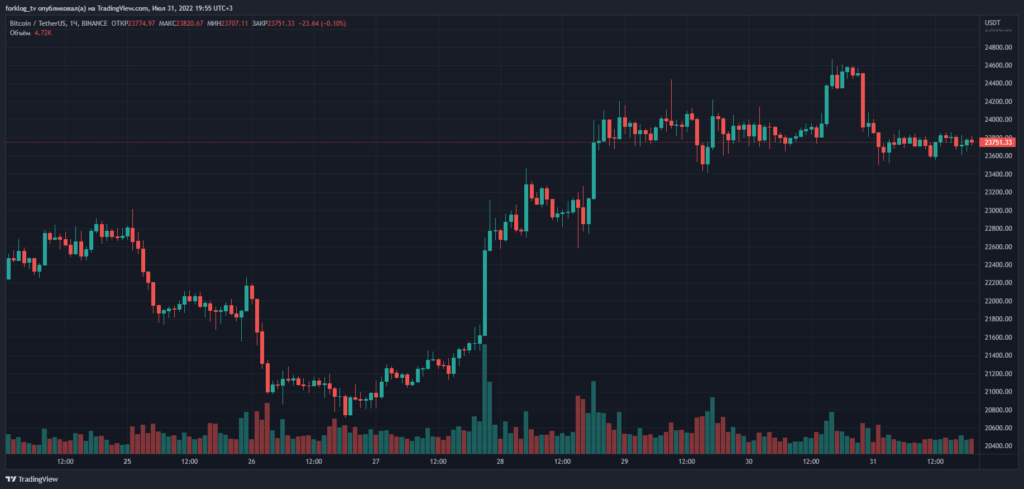 Ведущие криптовалюты отреагировали на новости ростом. За минувшую неделю цена биткоина увеличилась почти на 6%, Ethereum — на 10%. На момент написания котировки первый актив торгуется вблизи $23 750, второй — около отметки $1700.