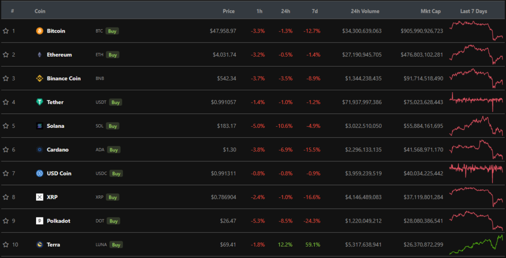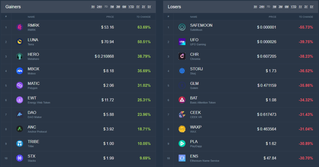 Биткоин потянул за собой и остальной рынок. Согласно CoinGecko, практически все цифровые активы из топ-10 по капитализации закрыли неделю в красной зоне. Исключением стал нативный токен блокчейн протокола Terra — LUNA. За неделю его цена выросла почти на 60%.