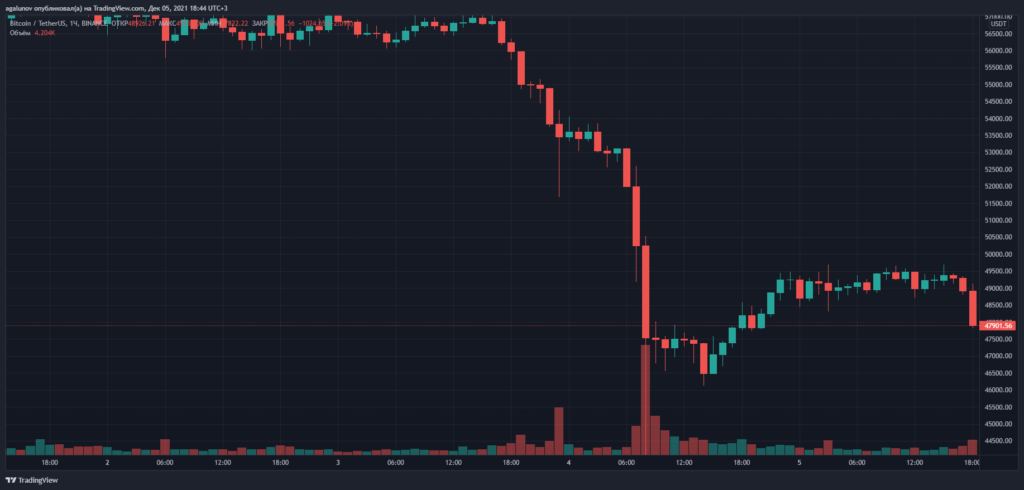 В субботу 4 декабря, котировки первой криптовалюты в моменте опустились до уровня $42 000. Снижение сопровождалось масштабной ликвидацией на рынке фьючерсов — $1,3 млрд по длинным позициям.