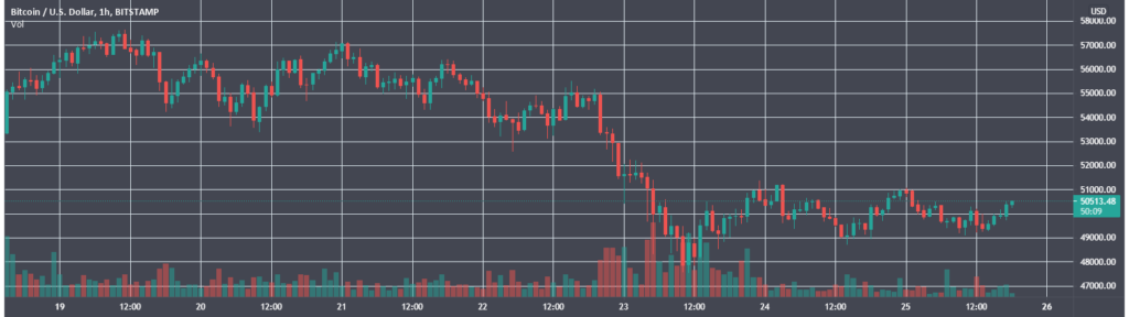 Практически одновременно с выходом на рекордные уровни курса Ethereum котировки биткоина перешли к стремительному снижению. В моменте цена опускалась ниже $48 000.