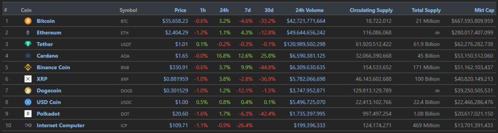 На момент написания первая десятка наиболее капитализированных активов выглядит так:
