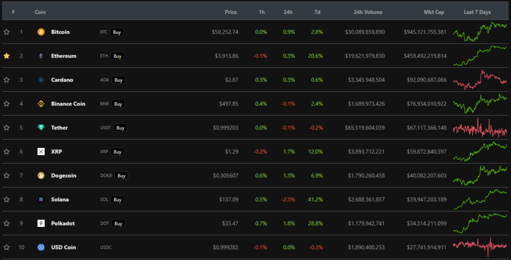 Цена биткоина превысила $50 000, Ethereum — $4000