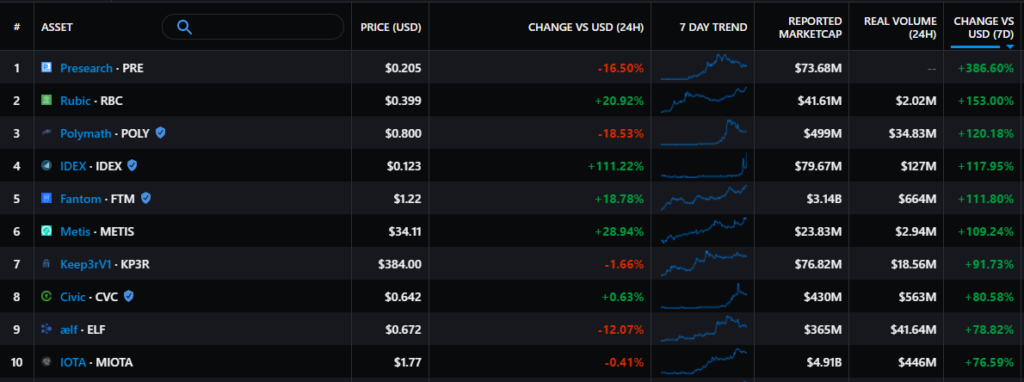 По данным сервиса Messari, из цифровых активов за последнюю неделю сильнее других подорожал токен децентрализованного поисковика Presearch. Цена PRE выросла на 386%, а капитализация достигла $73,68 млн.