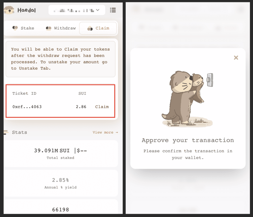 - Требования: стейк не менее 5 SUI; небольшое количество SUI (около $0.009) должно оставаться на кошельке для покрытия комиссий.