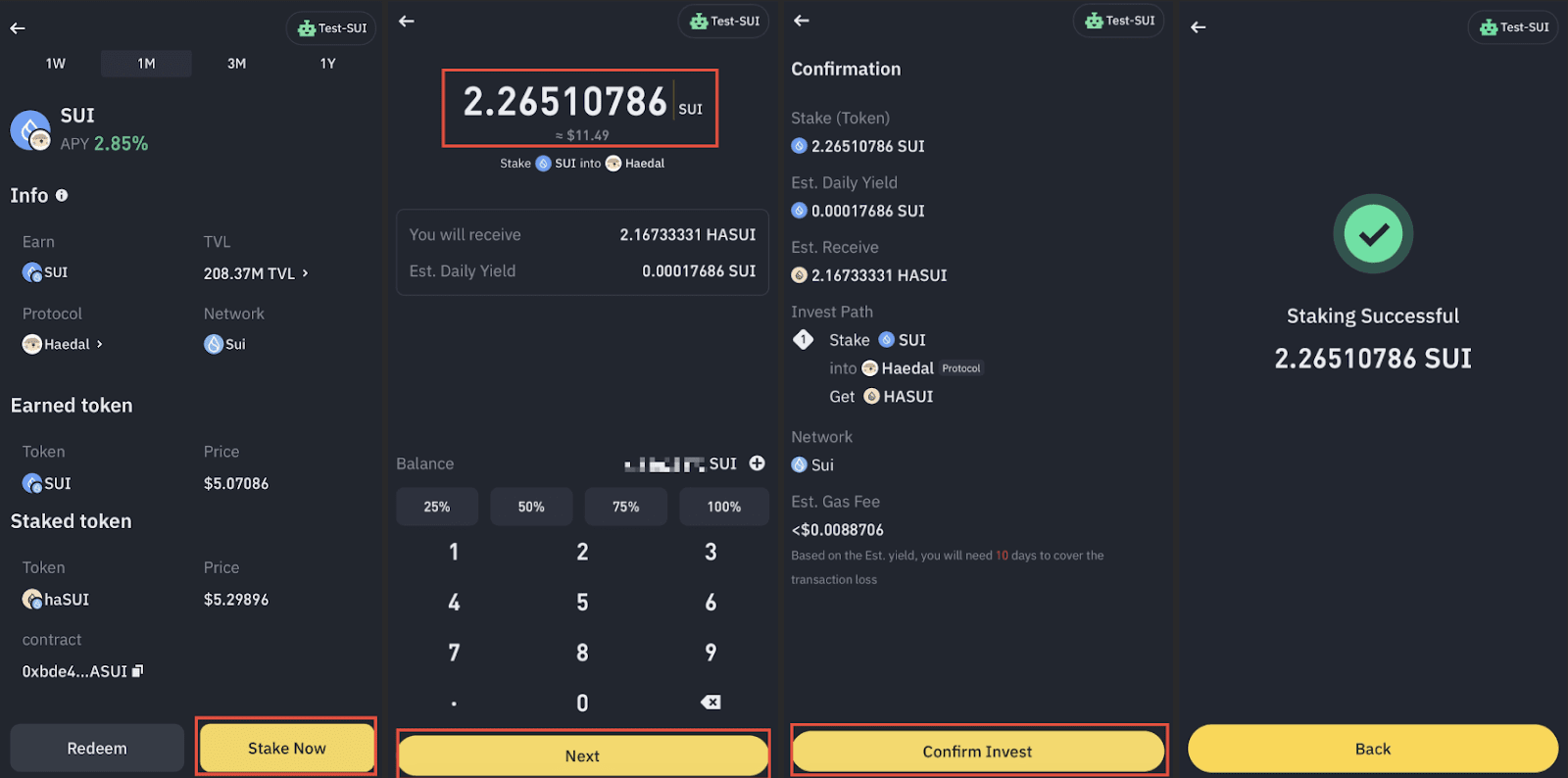 - После завершения перевода вернитесь на страницу стейкинга SUI Haedal и нажмите [Stake Now]. Введите минимум 5 SUI, нажмите [Далее] — [Подтвердить], чтобы завершить транзакцию.