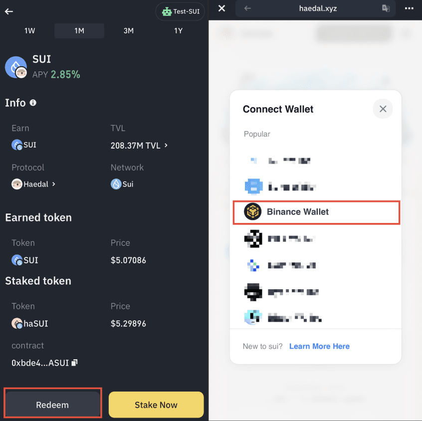 - Нажмите [Активировать], чтобы перейти в Haedal dApp. Подключите свой кошелек Binance.