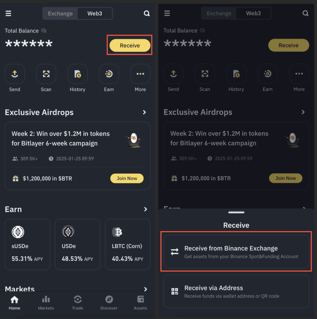- Чтобы убедиться, что у вас достаточно SUI, нажмите [Главная] — [Получить], чтобы загрузить средства с вашего актива Binance Exchange на ваш кошелек Binance.