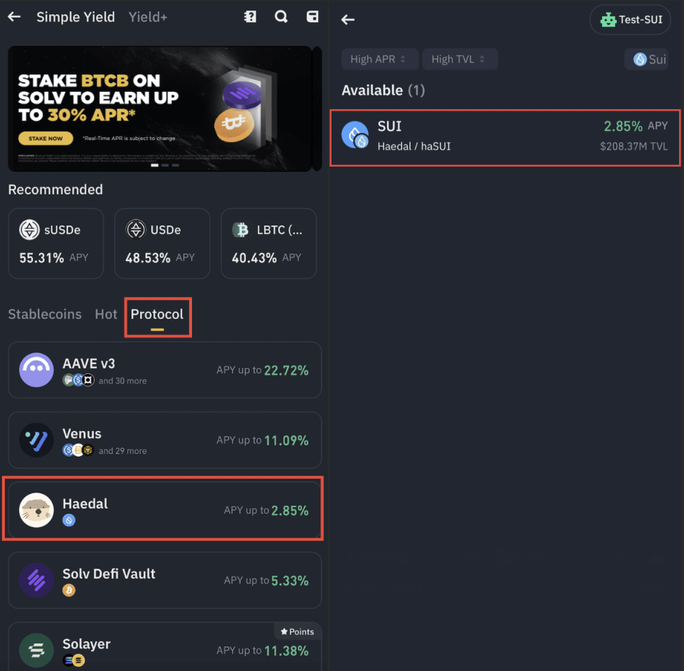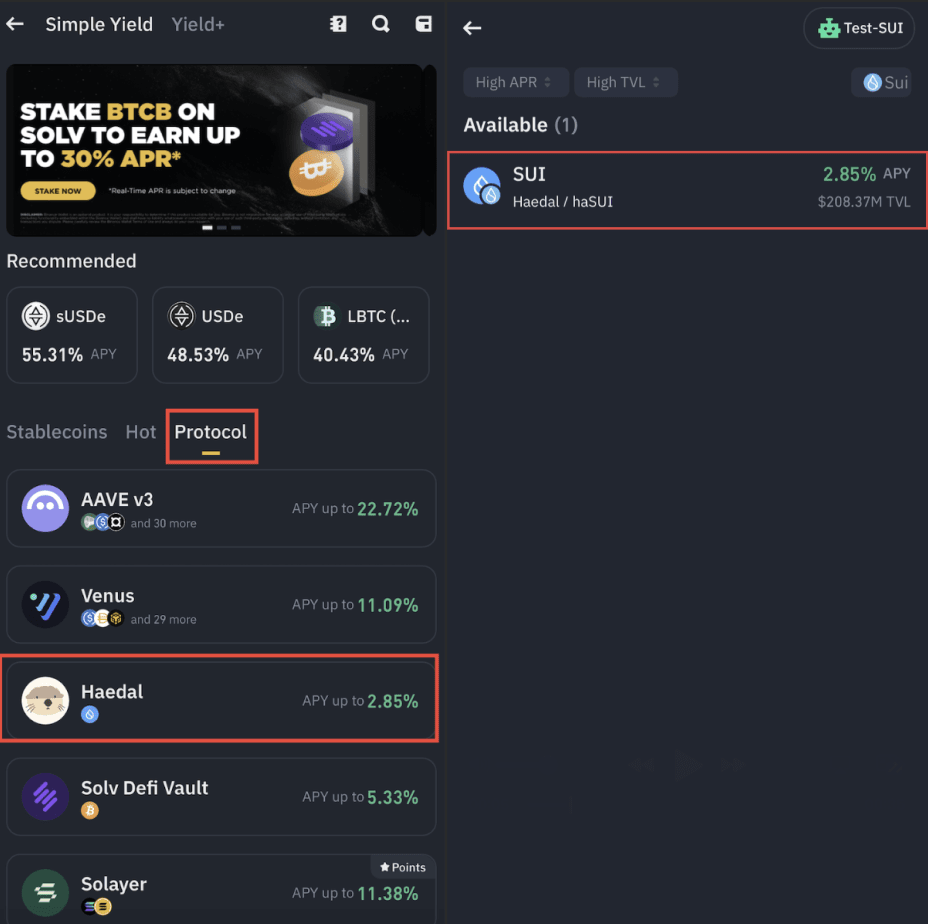 - Войдите в свой Binance Wallet и перейдите в [Earn] — [Simple Yield] — [Protocol] — [SUI]. Затем нажмите [Haedal].