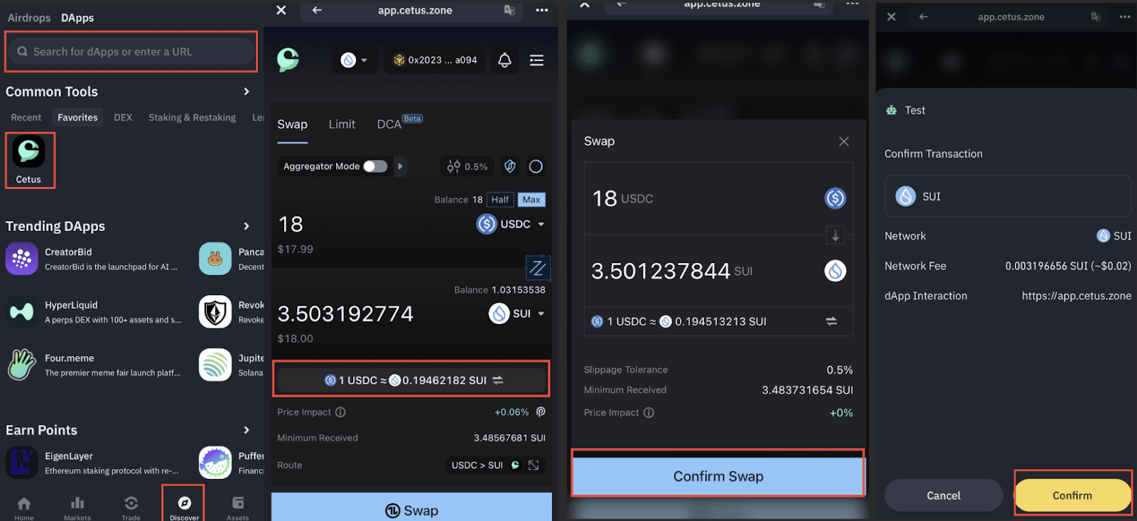 Обменяйте другую криптовалюту на SUI, посетив Cetus dApp на Binance Wallet.