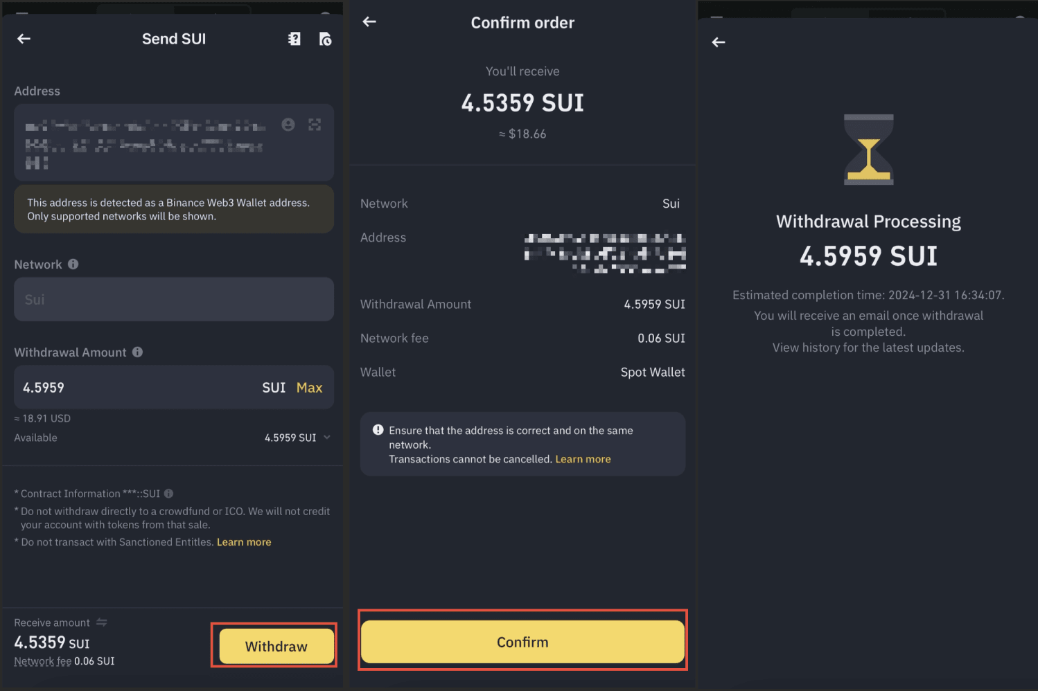 Обратите внимание, что может пройти около 24 часов, прежде чем вы сможете заявить токен. После подачи заявки вы получите SUI в цепочке Sui в вашем кошельке Binance.