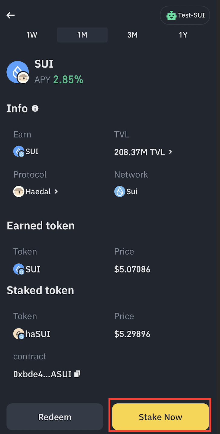 - Войдите в свой Binance Wallet и перейдите в [Earn] — [Simple Yield] — [Protocol] — [SUI] — [Haedal]. Затем нажмите [Stake] в интерфейсе стейкинга SUI.