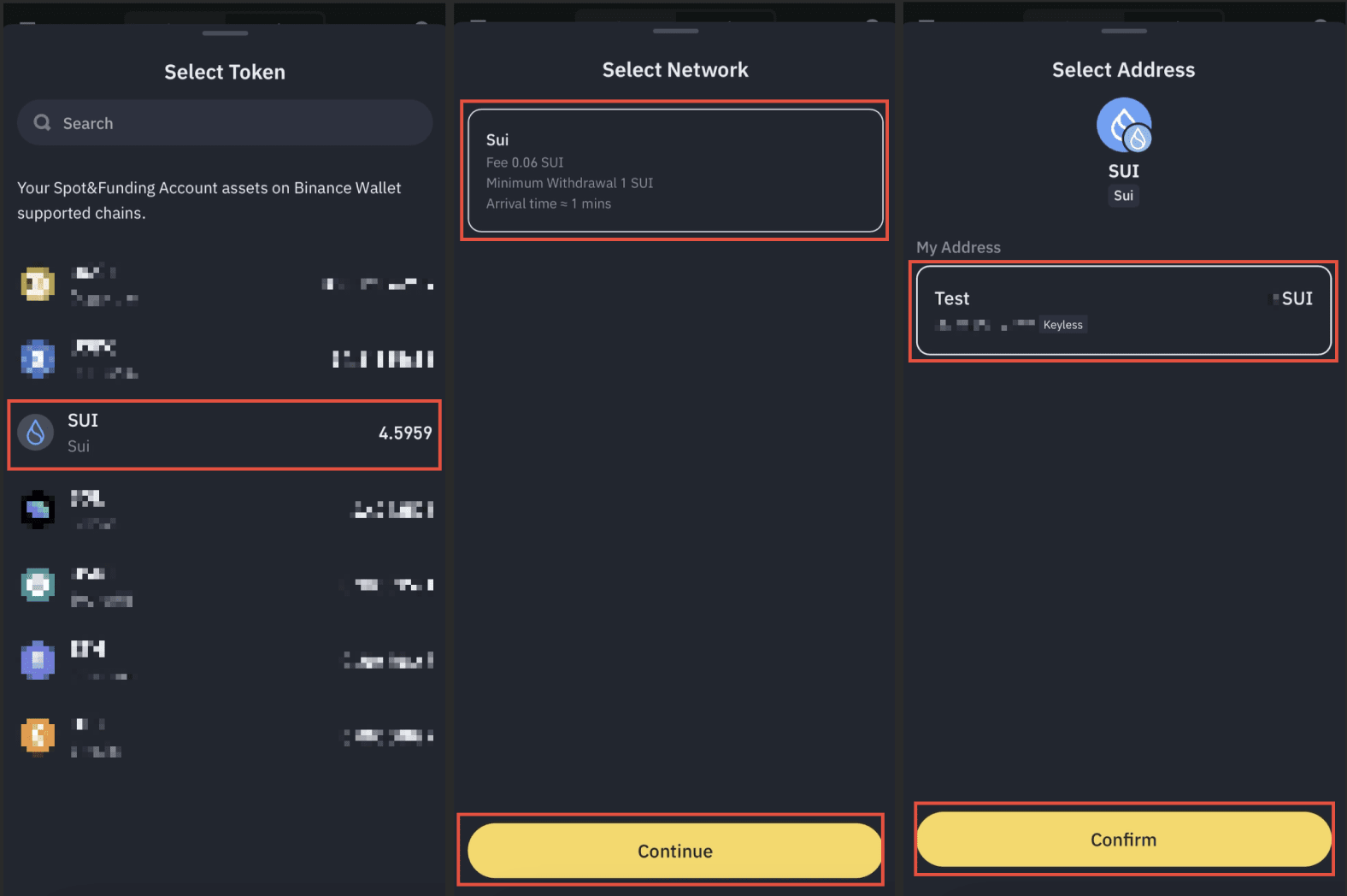 - Выберите [SUI] в разделе «Выбрать токен» и [Sui] в разделе «Выбрать сеть», выберите кошельки, с которых и на которые будет осуществляться перевод, затем нажмите [Подтвердить].