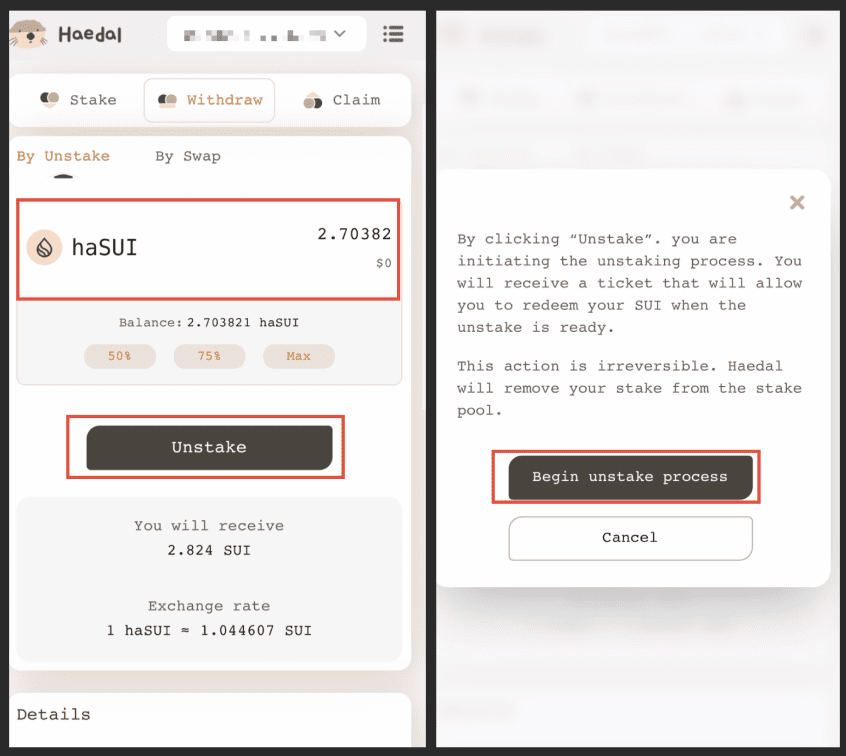 - Выберите [Вывод] — [Unstake] на странице «Stake». Введите желаемую сумму haSUI для вывода и нажмите [Unstake], чтобы отправить запрос.