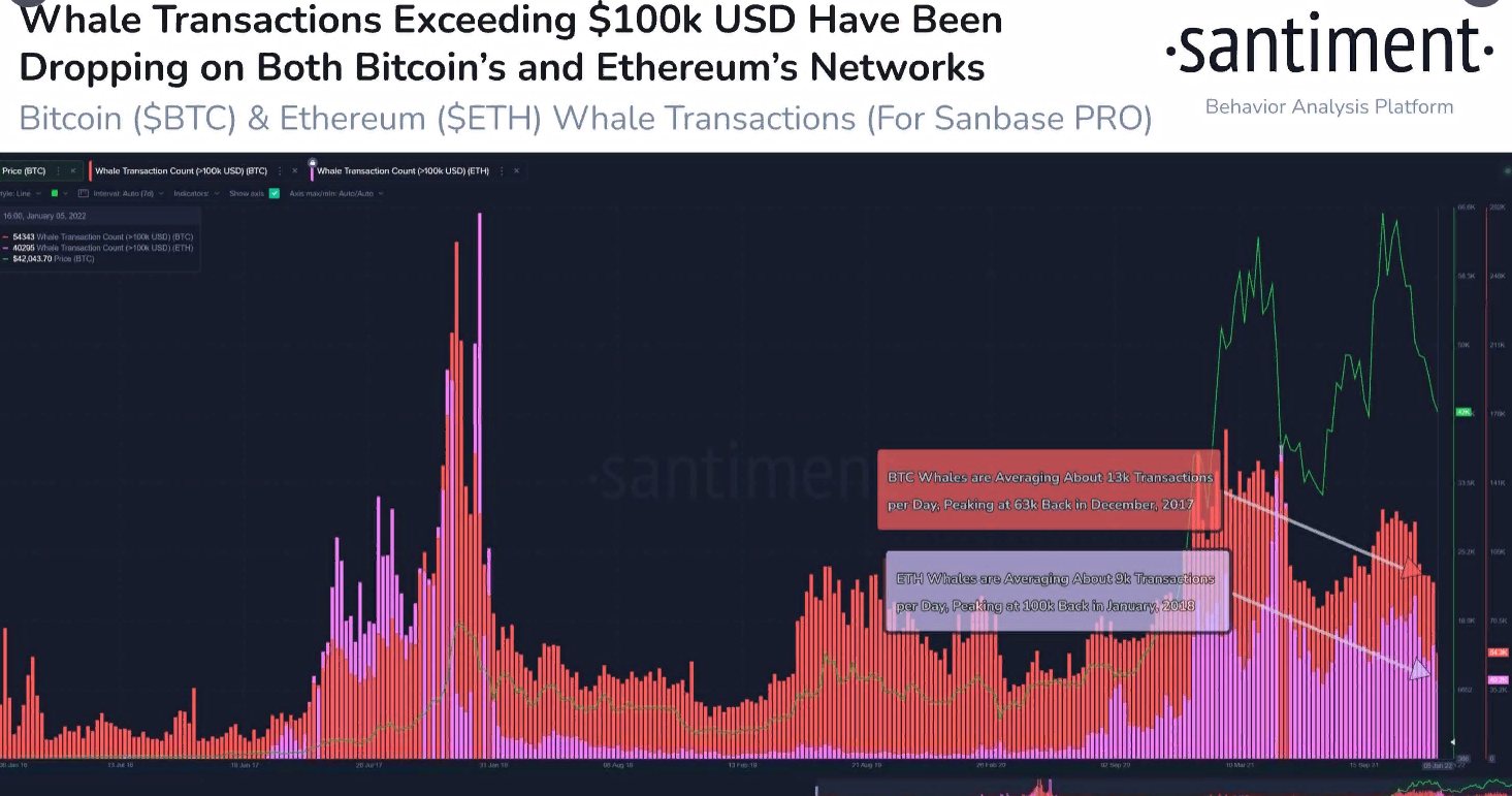 По данным Santiment, в сети биткоина резко сократилось количество крупных операций на суммы не менее $100 000. Такая тенденция не только говорит о нежелании китов подкачать криптовалюту, но и может сигнализировать о длительном этапе стагнации.